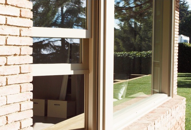 Finestres en guillotina de pi lacades