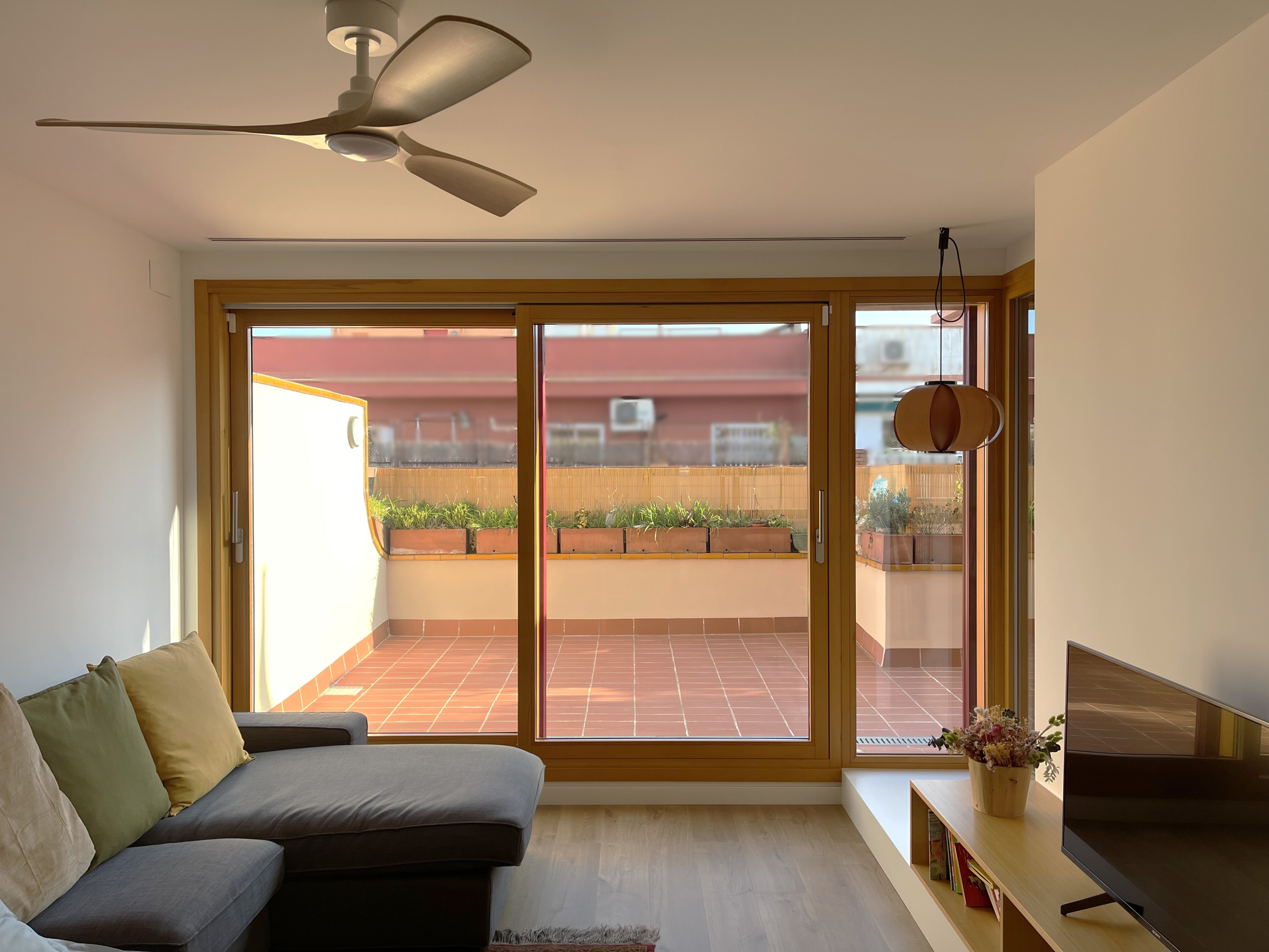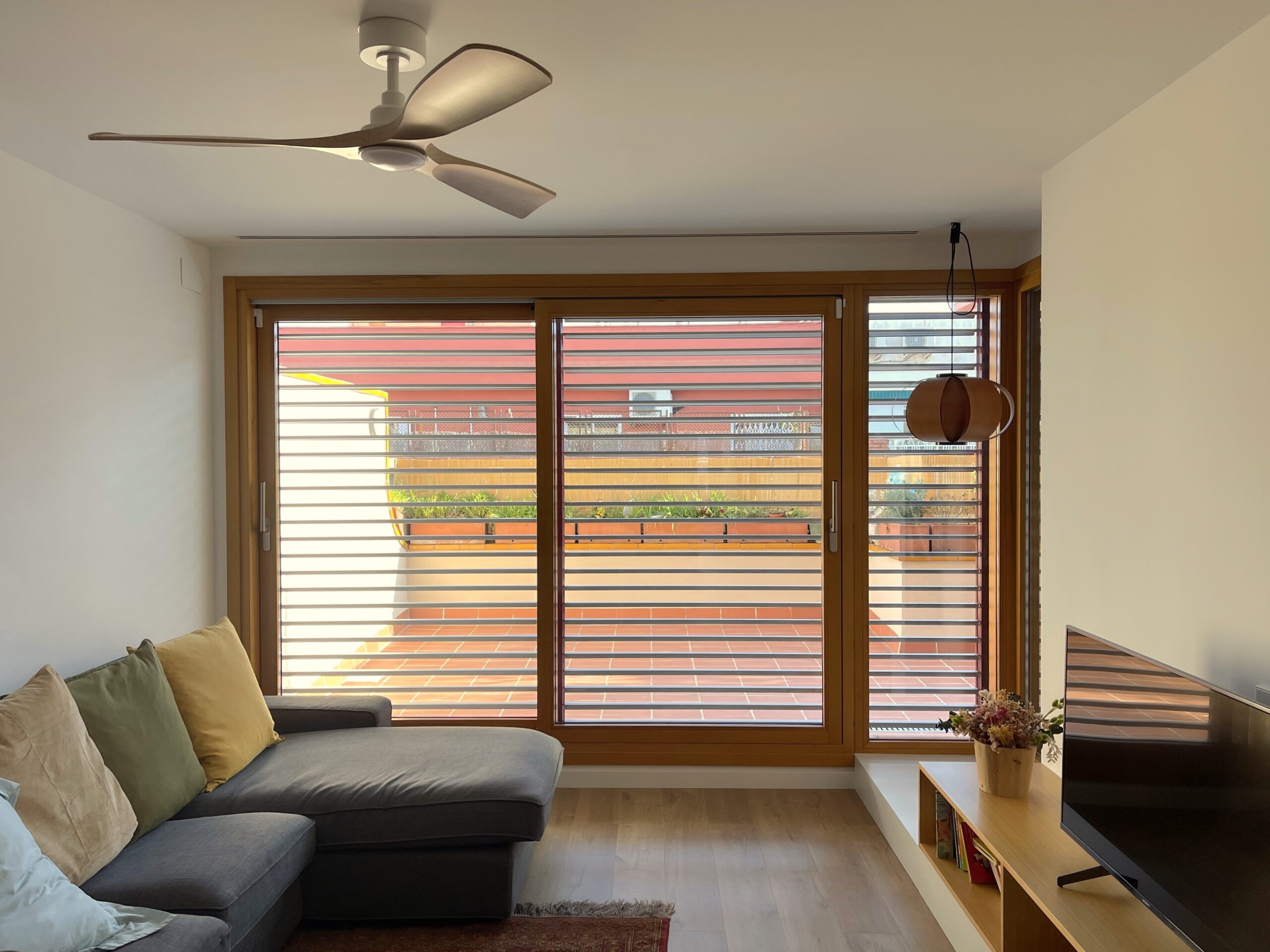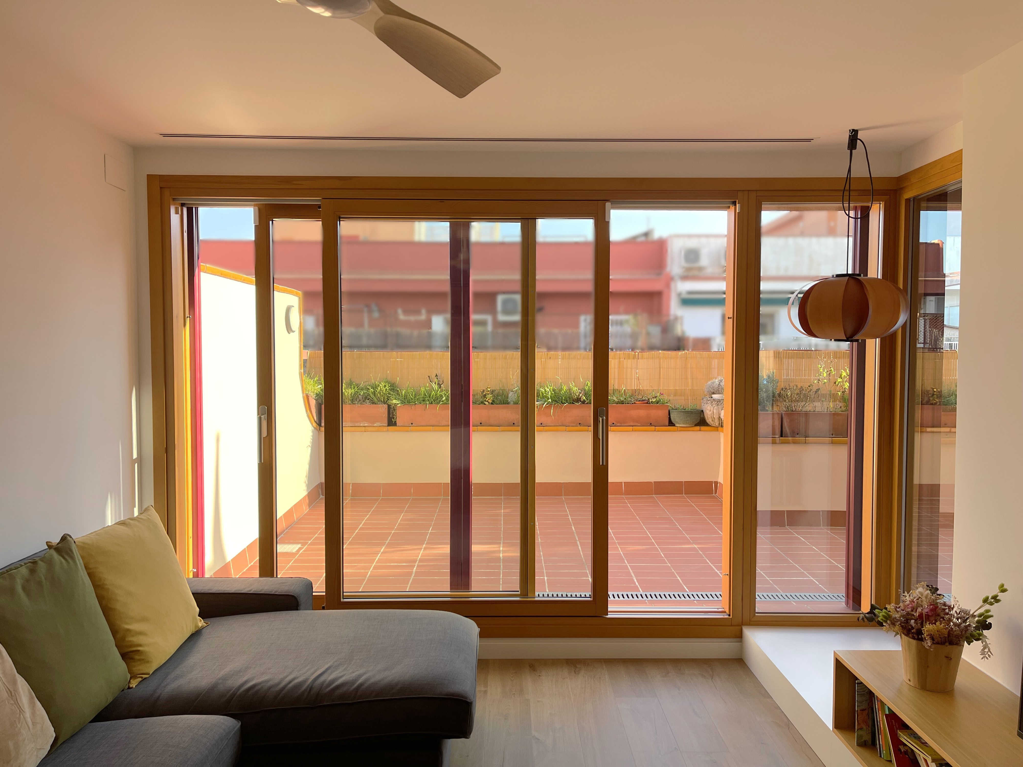 El proyecto se ubica en un luminoso ático en la ciudad de Badalona. Los propietarios tenían claro que las ventanas y correderas debían ser de madera natural, el único material que aporta la calidez y bienestar natural de “verdad”. La madera elegida por el pino, barnizada con una tonalidad muy suave de barniz sostenible por ambas caras.