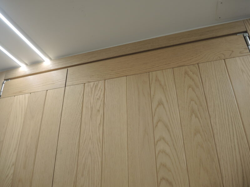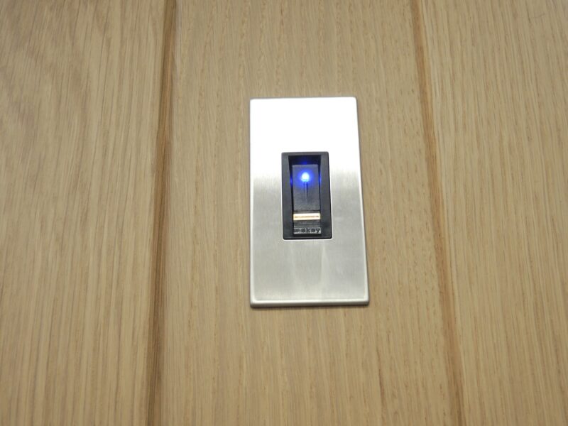 En la siguiente fase, instalamos toda la tecnología necesaria que nos solicita el proyecto, en este caso, instalamos en la puerta de entrada un control de acceso con huella dactilar integrado en el panel de madera.