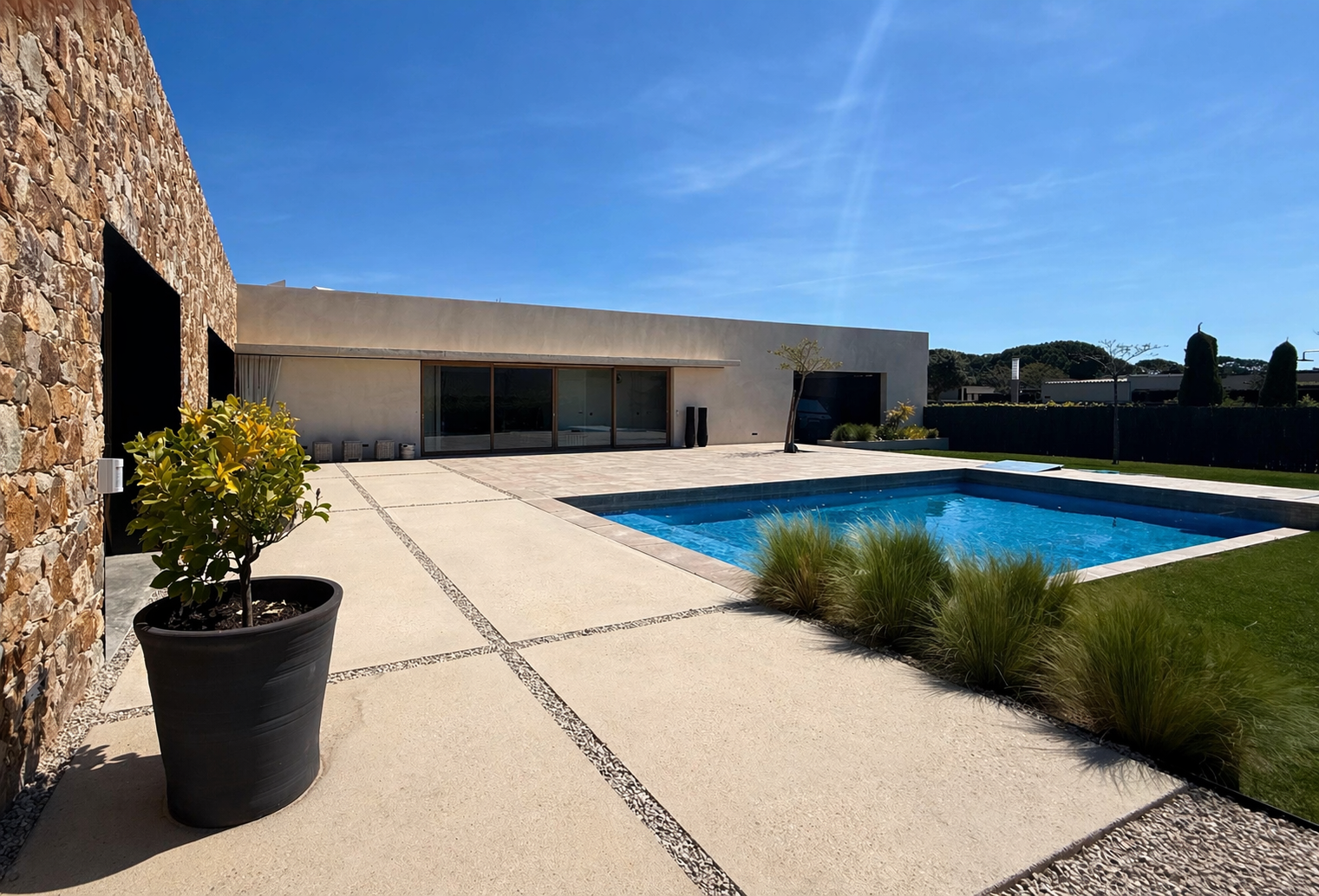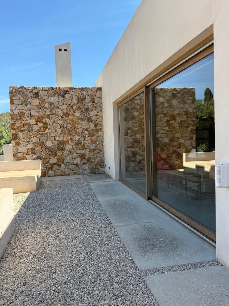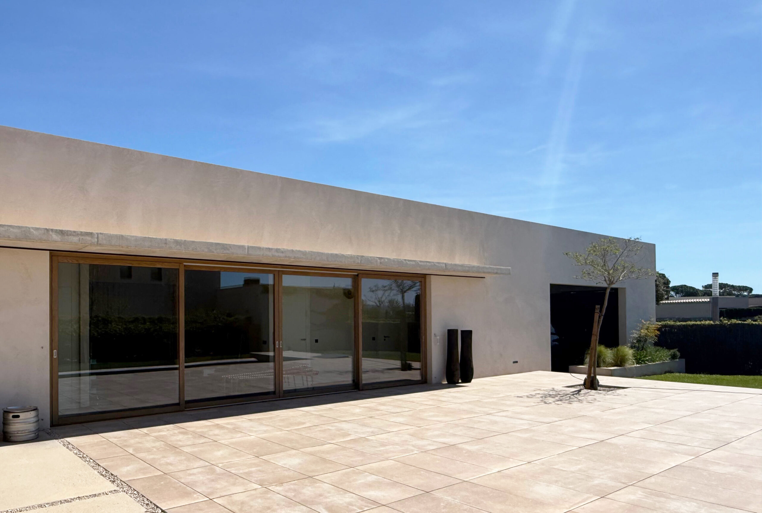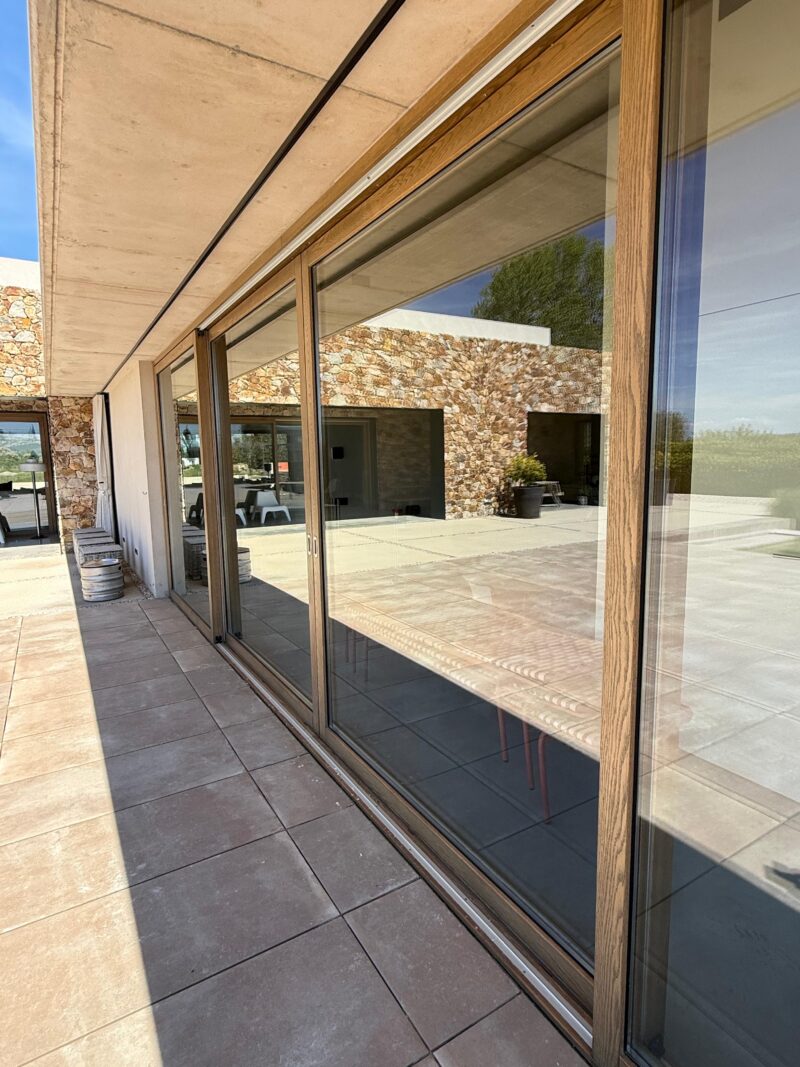 En la fachada principal 4 grandes correderas diseñadas con dos juegos de 2 hojas dan la bienvenida al jardín y piscina exterior, junto a otros juegos de correderas de 2 hojas en las habitaciones, todas ellas diseñadas en cota 0, perfectamente integradas en el pavimento, con una correcta evacuación del agua, y herméticamente eficientes frente al frío y al sol, con vidrios de capa para un mayor grado de protección solar, Climaguard by Guardian Glass.