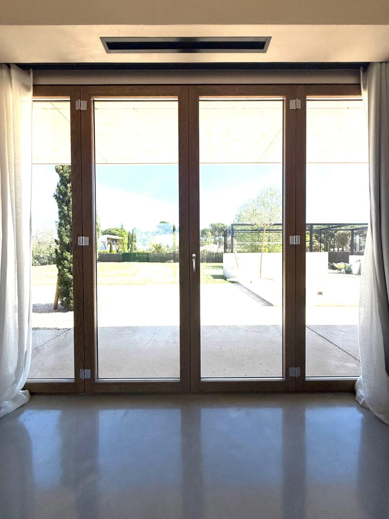 En la parte de la entrada, un acertado diseño formado por una balconera de dos hojas, y con apertura en acordeón. Un conjunto con alto aislamiento térmico, que permite la total obertura, sin una visión de los cerramientos, recogidos en cada lado.